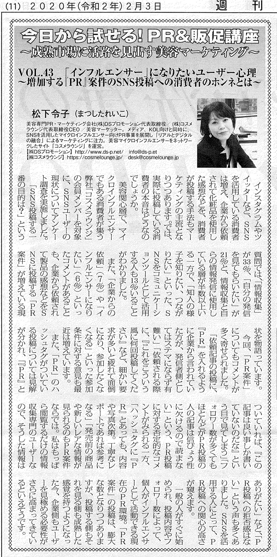 週刊粧業(第3193号 2020年2月3日付)に掲載されました